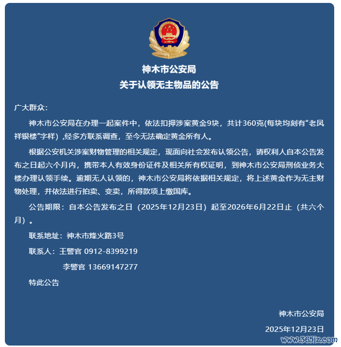 把柄公安机关涉案财物贬责的干系规章,现面向社会发布认领公告,请权柄东说念主自本公告密布之日起六个月内,佩戴本东说念主灵验身份证件及干系通盘权评释,到神木市公安局刑侦业务大楼办理认领手续。落后无东说念主认领的,神木市公安局将依据干系规章,将上述黄金行为无主财物处理,并照章进行拍卖、变卖,所得款项上缴国库。